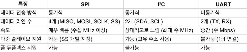 SPI는 속도가 빠르고 풀 듀플렉스가 가능하지만, SS 라인이 증가할수록 하드웨어 설계가 복잡해진다. 반면, I²C는 다중 슬레이브 구성이 더 간단하지만 속도가 비교적 느리다.
